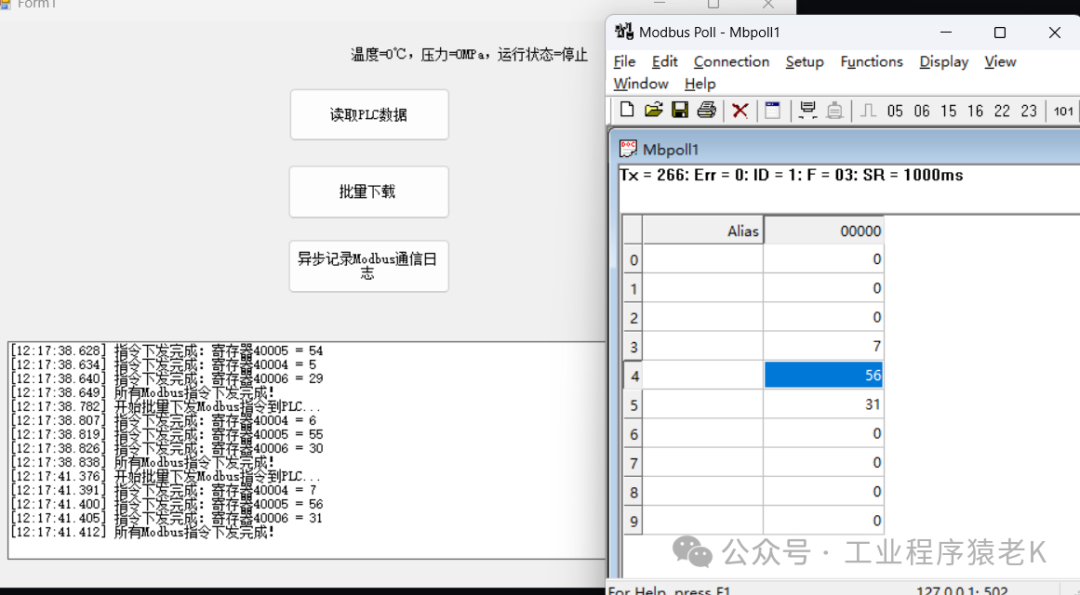 • • _plcIp/_plcPort:PLC 的网络地址,Modbus TCP 默认端口是 502(几乎所有 PLC / 模拟器都用这个);