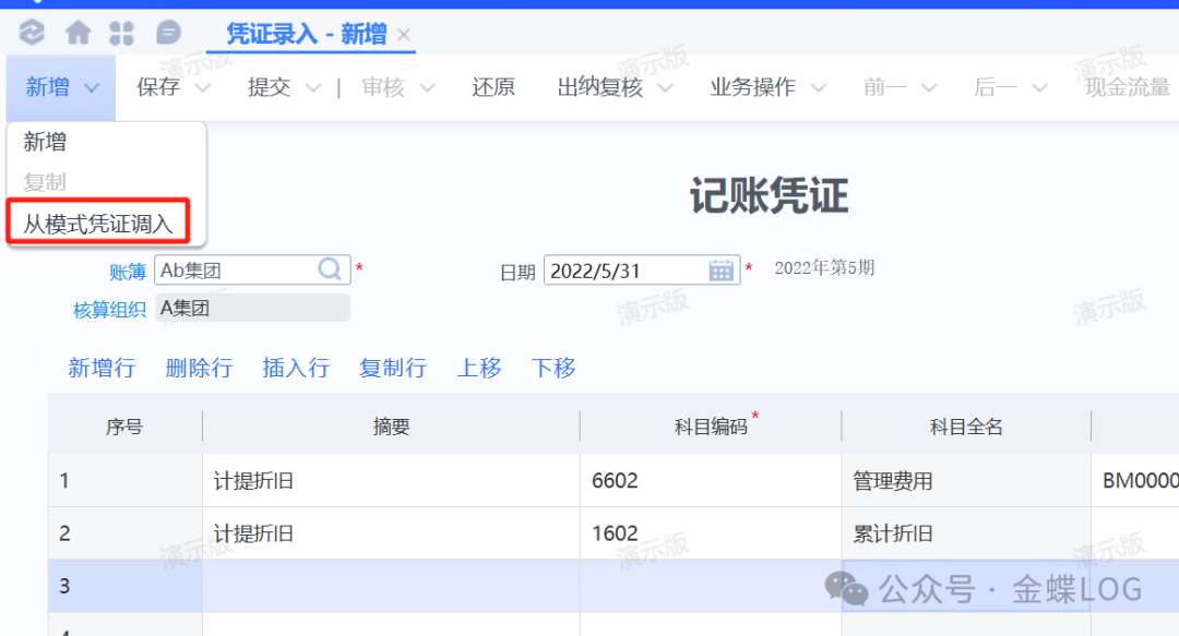 在新增凭证的时候就可以点击【从模式凭证调入】,选择创建好的凭证模板自动带出科目分录。