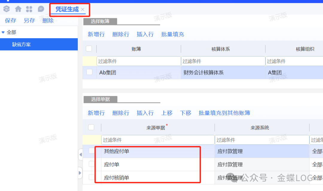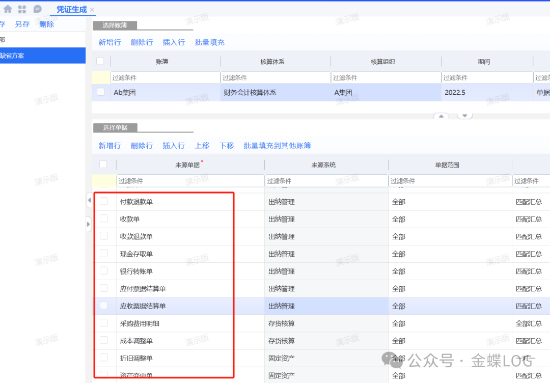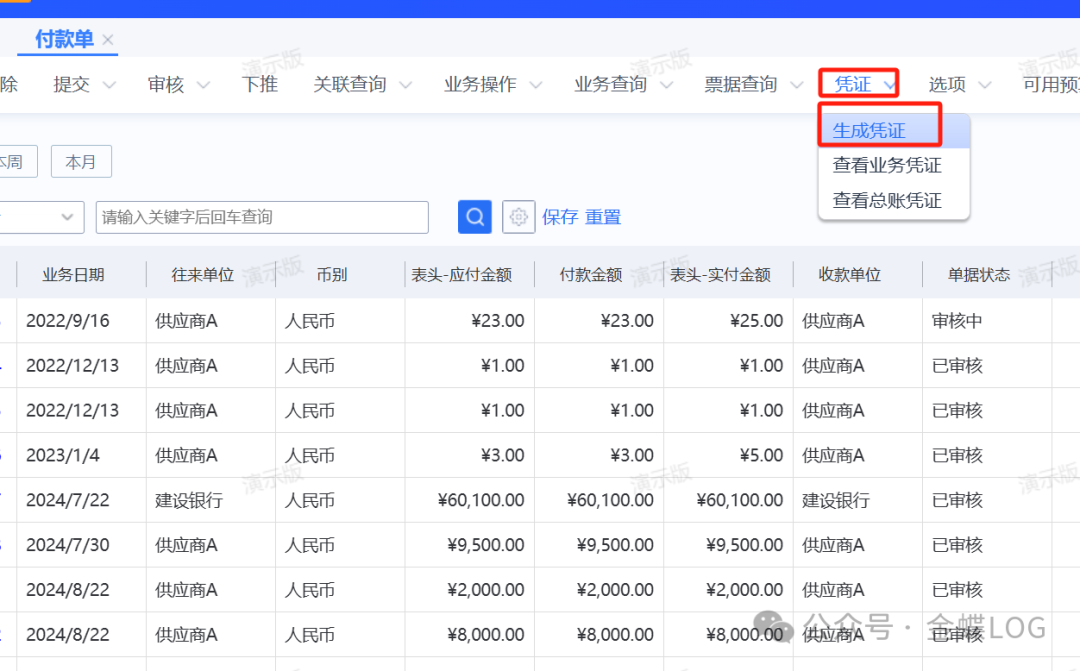单据列表里有一些单据配置了【生成凭证的按钮,此时则可以在列表勾选对应单据生成凭证;