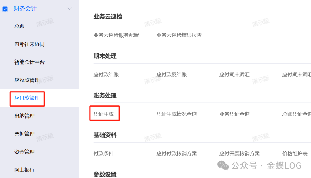 系统的一些模块里会有【凭证生成】功能。比如应付、应收、出纳,存货这些模块都会有。
