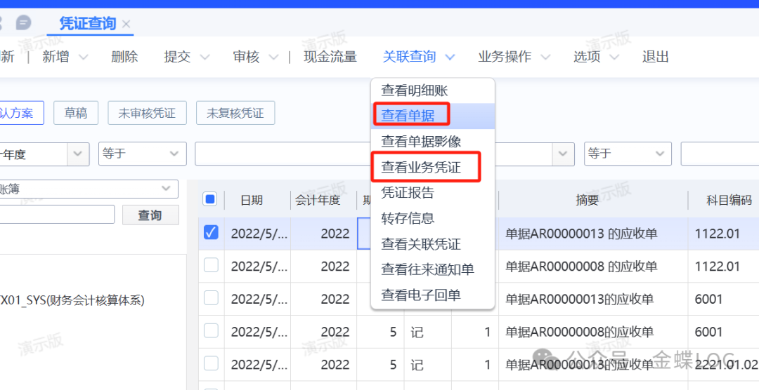 跟凭证生成功能一样,系统一些模块里面会有【业务凭证查询】和【总账凭证查询】的功能。