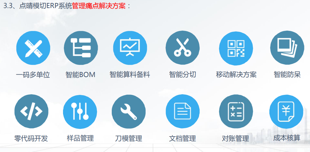 面对当前制造企业数字化、智能化转型迫切需求,ERP系统是实现模切企业精细化管理的重要途径,能够帮助模切企业实现透明化生产管理,受到越来越多模切企业的认可和重视。点晴模切ERP系统是一款专为模切行业提供可视化生产管理系统,强调对模切企业内部甚至外部的资源进行优化配置,从销售、采购、 生产(MRP/排产/制程管控)、仓库(原辅料/成品/ 刀模)、工程( BOM/工艺/样品)、品质、财务 (对账/存货核算/总账)等多维度进行精细化管理,全面提高模切企业管理能力,以管理的方式达到降本增效的目的。