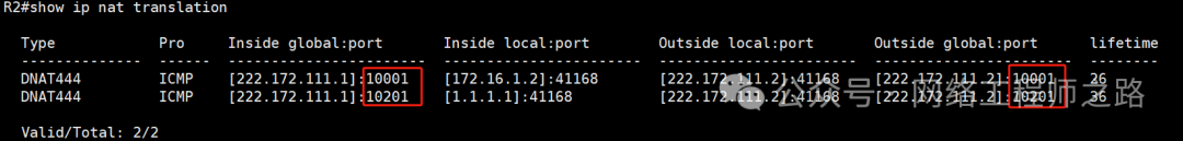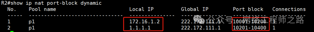R2上查看port-block dynamic动态分配模块,172.16.1.2分配的是10001-10200,1.1.1.1分配的是10201-10400模块,就可以固定IP地址分配的动态端口信息,为后面的nat匹配更加有利,可以精准匹配端口来进行分流。