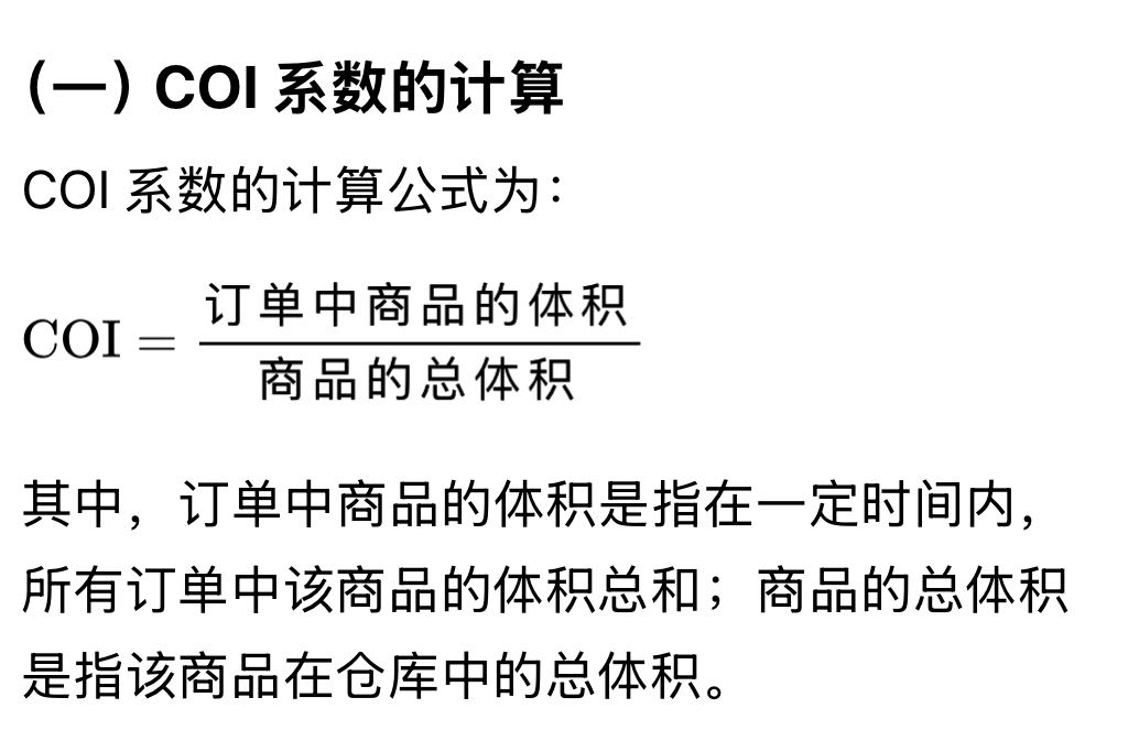在实际操作中,基于分类的库位分配方法被广泛应用。其中,COI 系数(cube-per-order index)是一个重要的参考指标。COI 系数指的是每单位体积中的货物被订单取走的频率。通过计算 COI 系数,可以优化货物的存储位置布局,从而减小拣货成本。