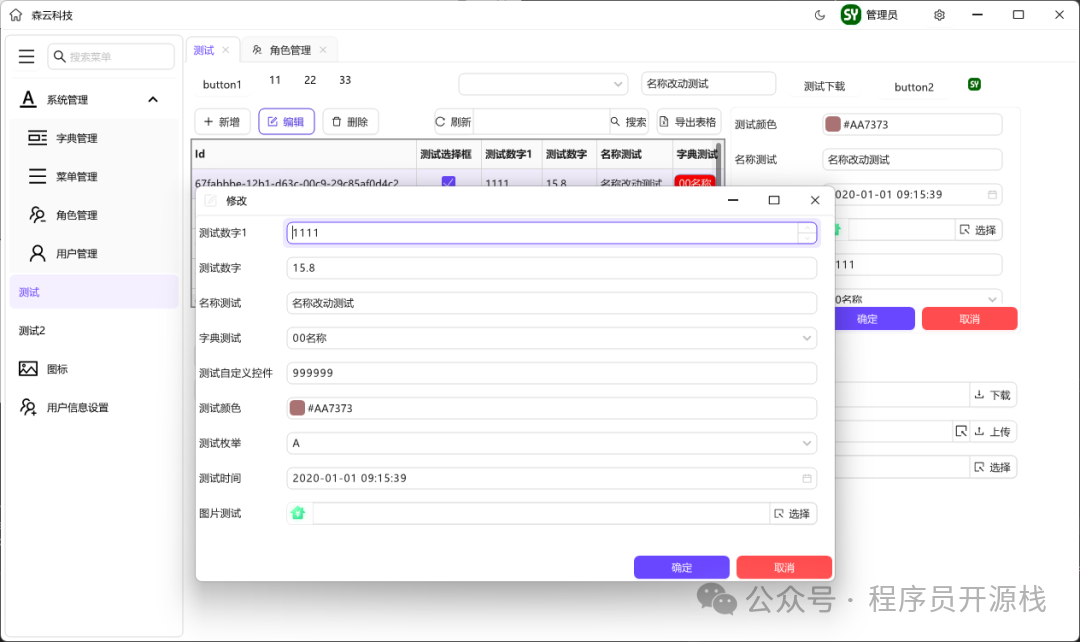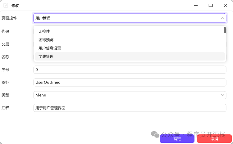 • 菜单管理:实现菜单的增删改查,支持自定义页面控件和样式。