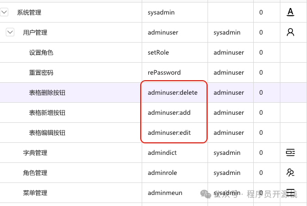 //菜单中请设置权限 useradmin:edit, useradmin:delete, useradmin:add