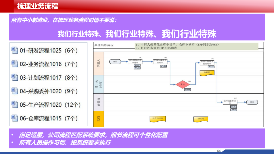 11年,在东莞一家五金厂上ERP,五金厂的人员素质大家是了解的,招式更简单:梳理基础资料,盘点库存,操作培训,所有人员严格按系统流程作业,四个月,系统就上去了。
