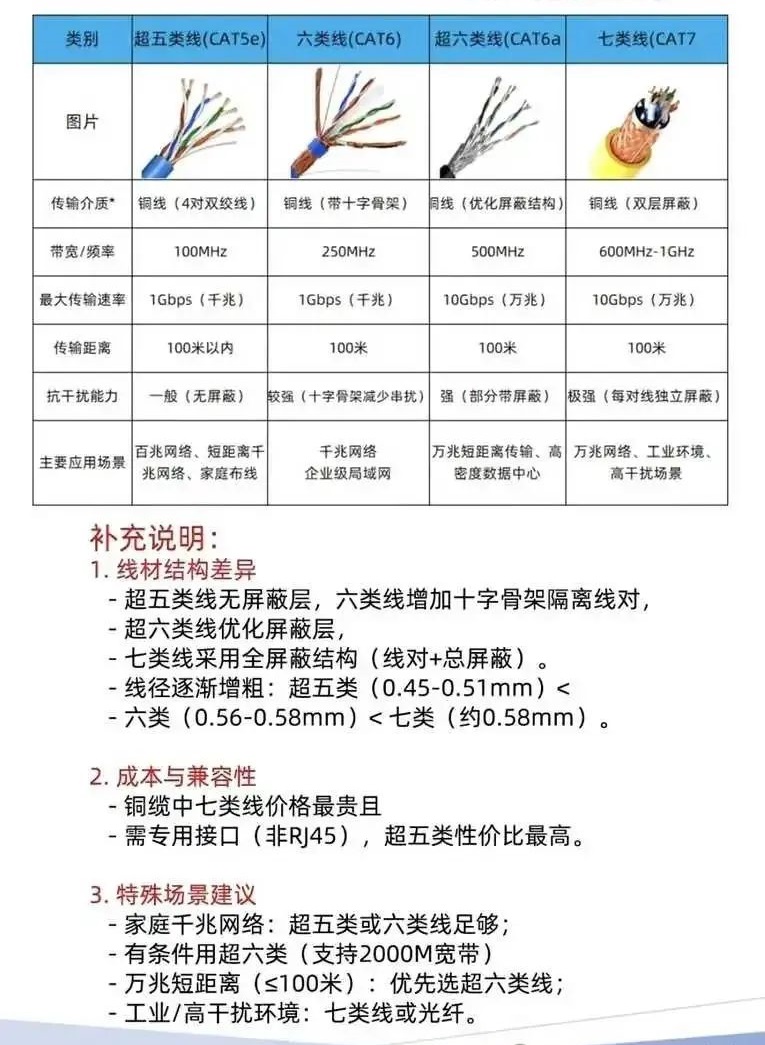 下面就是五六七类网线的区别,五类线是不推荐了,建议最低上六类线,支持千兆网络,推荐超六类,这样将来家里网速从1000M再提升到2000M甚至更高就具备条件了。