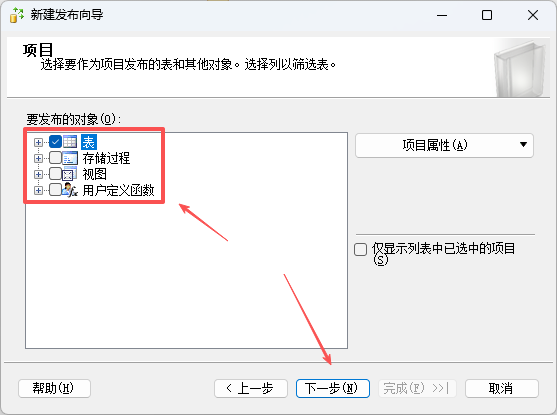 4.  选择需要发布的对象(表、视图等),下一步