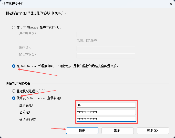 9. 设置在sqlserver代理服务账户下运行,使用登录名,输入账号密码,点击确定