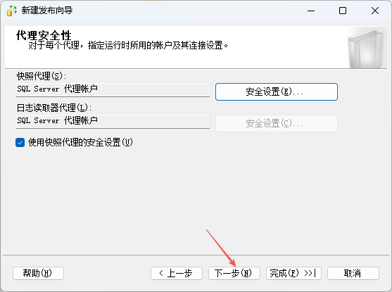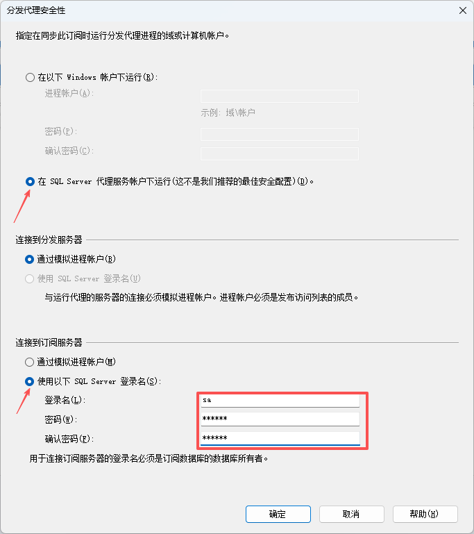 7.  选择在sqlserver  代理服务器下运行,用登录名登录,输入订阅服务器登录名的账号密码