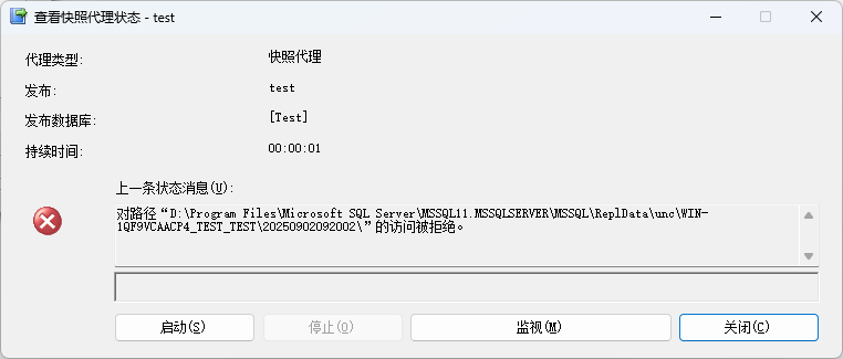右键发布--查看快照代理状态,查看是否运行成功。如果出现以下问题: