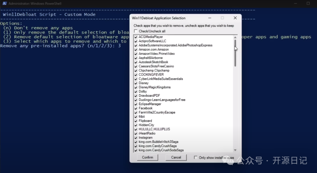 - 清理系统预装应用: 支持一键删除大量微软和第三方预安装的应用(如 Cortana、Bing AI、Xbox 控件、Candy Crush 等)。