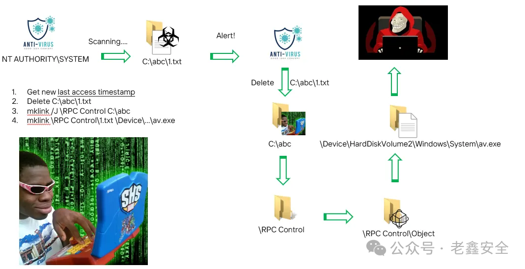 比如有一个以NT AUTHORITY\SYSTEM身份运行的杀毒服务。黑客在设备磁盘上放置恶意的EICAR测试文件,随后开始循环检查文件的最后访问时间戳”,试图检测其文件是否被访问。当杀毒软件访问该文件并识别出恶意内容后,尝试将其从磁盘删除。然而就在此时,黑客将其文件替换为符号链接——该链接通过结合NTFS挂载点与对象管理器符号链接,最终指向杀毒软件自身的核心文件。如此一来,杀毒软件便完成了自我删除的窒息操作