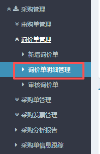 1. 进入ERP系统之后,在左侧的功能菜单里找到“采购管理”,点开“询价单管理”,点击“询价单明细管理”。