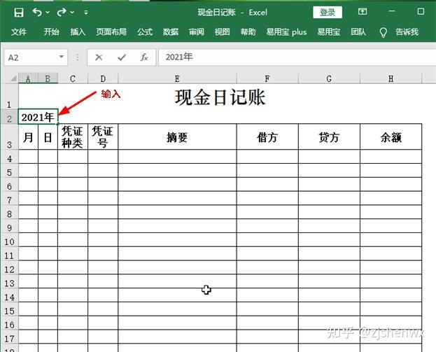 打开如下图示的“现金日记账”模板文件,选中A2单元格,在编辑栏中将“0000”修改为“2021”。
