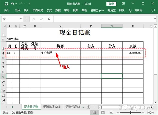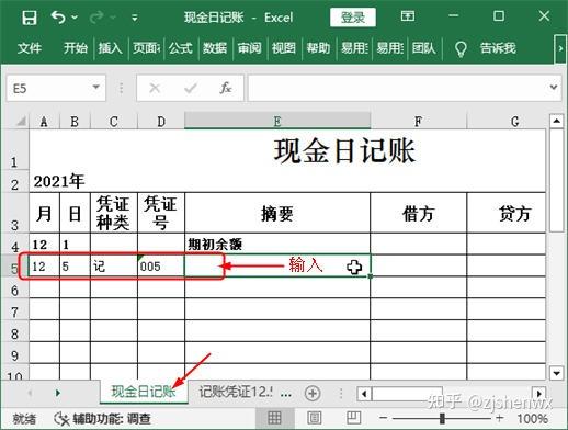 使用此模板登记现金日记账之前,需要手动输入该账簿所属会计期间的年份以及“库存现金”科目期初余额的数据。