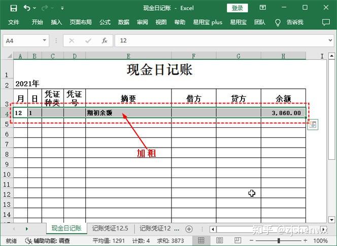 在第4行的单元格的相应位置输入期初余额栏目的有关数据,即表示12月1日时,“库存现金”科目的期初余额为3860元。