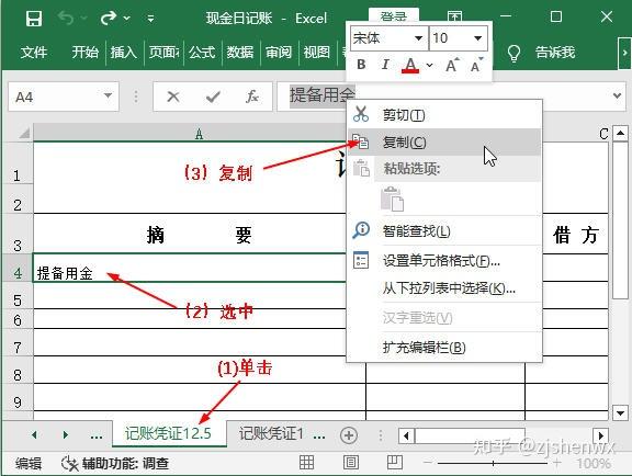 (1)重新切换到“记账凭证12.5”工作表;(2)选中A4单元格;(3)在编辑栏中复制摘要内容,同时记住库存现金的金额方向和金额数据。