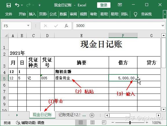(1)再次切换回“现金日记账”工作表;(2)选中E5单元格,在编辑栏中粘贴复制的摘要;(3)在F5单元格中输入“库存现金”科目的借方发生额。