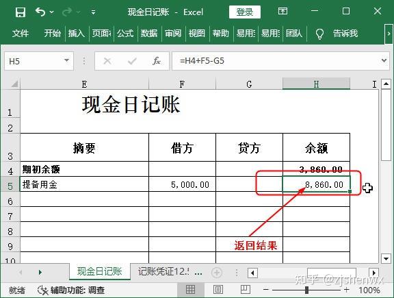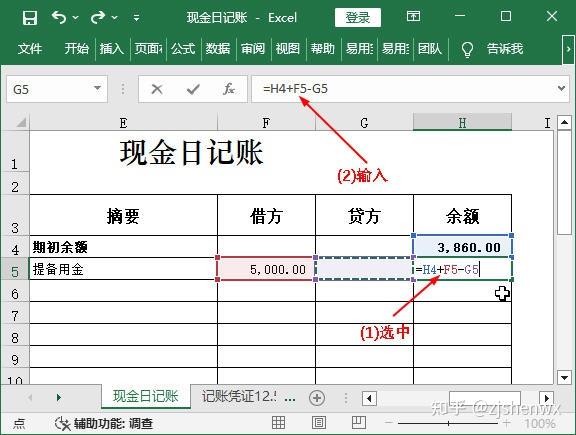 (1)选中H5单元格;(2)在编辑栏中输入“=H4+F5-G5”,表示库存现金的本日余额=上日余额+本日借方发生额-本日贷方金额。