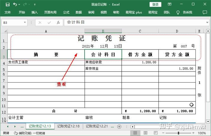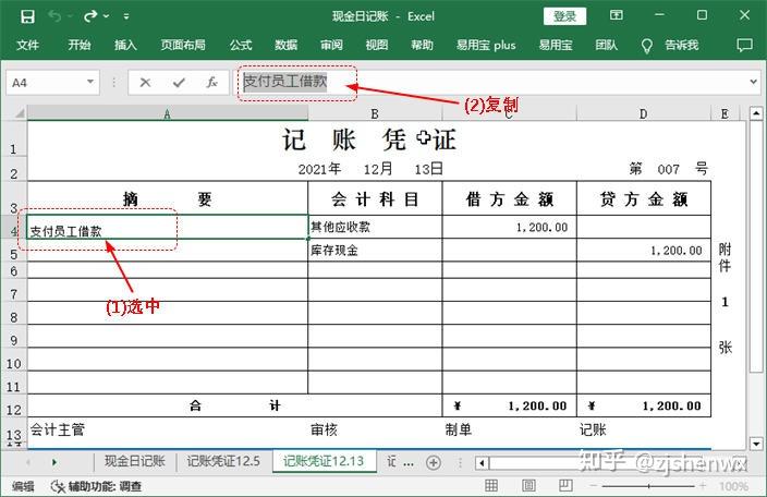 (1)重新切换到“记账凭证12.13”工作表,选中A4单元格;(2)在编辑栏中复制摘要内容,同时记住库存现金的金额方向和金额数据。