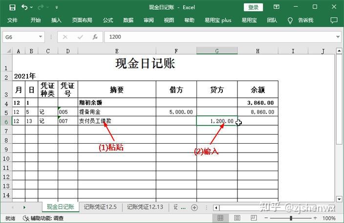 (1)再次切换回“现金日记账”工作表;(2)选中E6单元格,在编辑栏中粘贴复制的摘要;(3)在G6单元格中输入“库存现金”科目的贷方发生额。
