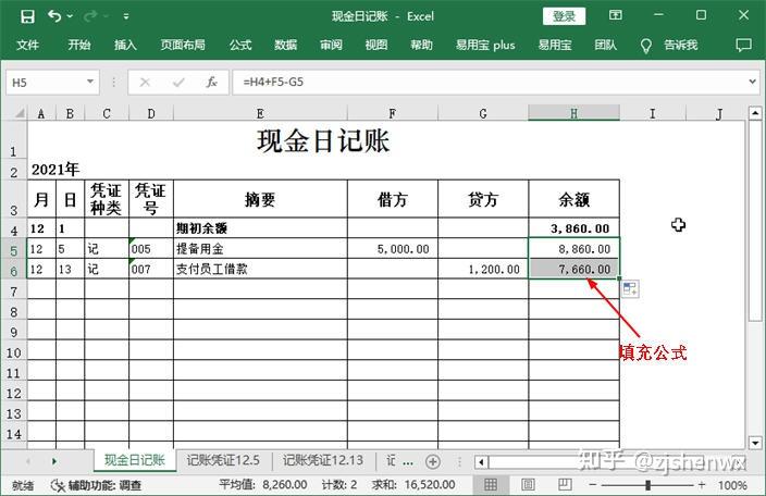 选中H15单元格,拖动其填充柄至H6单元格,即可自动计算出这笔经济业务发生后的现金金额。