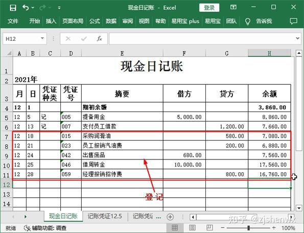 通过输入和复制记账凭证中的相关数据,可以很快完成现金日记账的登记工作。对于现金日记账余额的输入,则可手动设计公式来实现自动计算。
