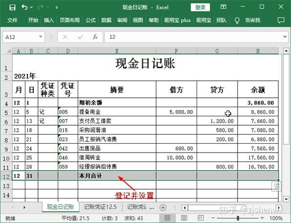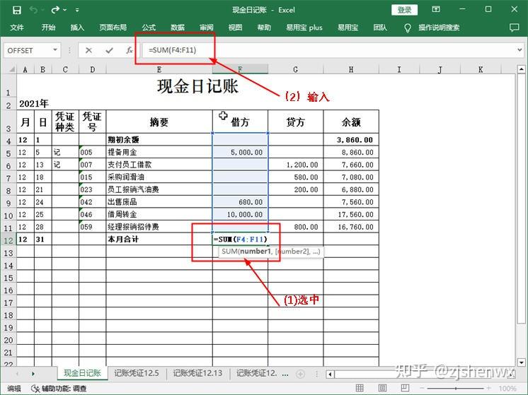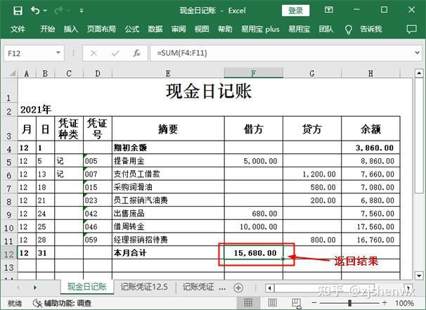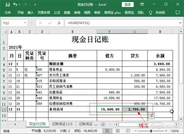 将本月发生的经济业务登记到现金日记账后,需要进行本月合计。计算本月借方发生额与贷方发生额的合计数,可以利用SUM函数来完成。每月库存现金的最终的余额,则可以利用另一种公式来计算,从而达到验证余额是否正确的目的。