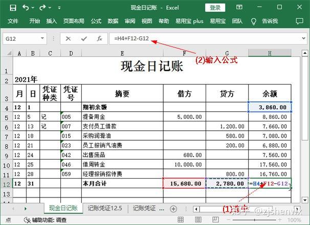 (1)选中H12单元格;(2)在编辑栏中输入“=H4+F12-G12”,表示期末余额=期初余额+本期借方发生额-本期贷方发生额。