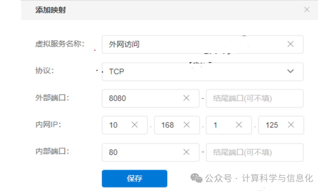 1、首先检查您设置的端口映射是否正确映射到您内网的服务器,IP地址是否为您服务器的IP地址。