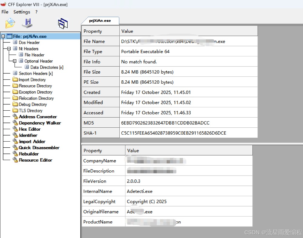 1.功能介绍CFF Explorer 是一款专为 Windows PE 文件(如 EXE、DLL、SYS)设计的多功能工具,核心功能包括深度结构分析、可视化编辑和逆向工程辅助。它由 Daniel Pistelli 开发,支持 PE32/PE64 格式,提供图形化界面和脚本扩展,广泛应用于软件调试、恶意代码分析、资源修改等场景。 1.PE 文件深度解析结构可视化:直观展示 PE 文件的 DOS 头、NT 头、节表、导入表、导出表、资源节等核心组件,支持字段级编辑。 高级分析: