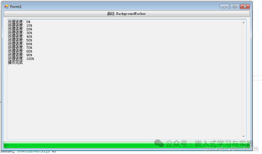 worker.ReportProgress(i, $"处理进度: {i}%");            }        }        private void BackgroundWorker_ProgressChanged(object sender, ProgressChangedEventArgs e)        {                        progressBar.Value = e.ProgressPercentage;            textBoxLog.AppendText($"{e.UserState}\r\n");        }        private void BackgroundWorker_RunWorkerCompleted(object sender, RunWorkerCompletedEventArgs e)        {            btnStart.Enabled = true;