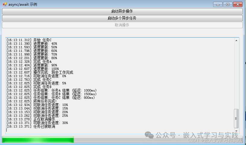 private async void btnStartAsync_Click(object sender, EventArgs e)        {            LogMessage("开始异步操作...");            btnStartAsync.Enabled = false;            try            {                                var progress = new Progress<int>(percent =>                {                    progressBar.Value = percent;                    LogMessage($"进度更新: {percent}%");                });                                string result = await DoAsyncWork(progress);                LogMessage($"操作完成: {result}");                                await StartCancellableWork();            }            catch (OperationCanceledException)            {                LogMessage("操作被取消");            }            catch (Exception ex)            {                LogMessage($"操作出错: {ex.Message}");            }            finally            {                btnStartAsync.Enabled = true;            }        }
