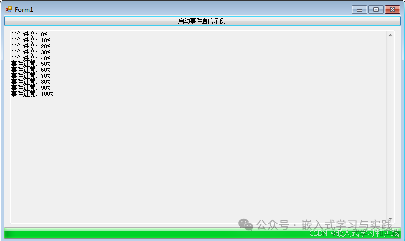 public partial class Form1 : Form    {                public event EventHandler<ProgressEventArgs> ProgressUpdated;        public Form1()        {            InitializeComponent();                        this.ProgressUpdated += OnProgressUpdated;        }        private void btnStart_Click(object sender, EventArgs e)        {            Thread workerThread = new Thread(new ThreadStart(WorkerWithEvents));            workerThread.IsBackground = true;            workerThread.Start();        }        private void WorkerWithEvents()        {            for (int i = 0; i <= 100; i += 10)            {                Thread.Sleep(400);                                OnProgressUpdated(this, new ProgressEventArgs(i, $"事件进度: {i}%"));            }        }                protected virtual void OnProgressUpdated(object sender, ProgressEventArgs e)        {                        if (this.InvokeRequired)            {                this.BeginInvoke(new Action<object, ProgressEventArgs>(OnProgressUpdated), sender, e);                return;            }                        progressBar.Value = e.Percentage;            textBoxLog.AppendText($"{e.Message}\r\n");        }    }        public class ProgressEventArgs : EventArgs    {        public int Percentage { get; set; }        public string Message { get; set; }        public ProgressEventArgs(int percentage, string message)        {            Percentage = percentage;            Message = message;        }    }}