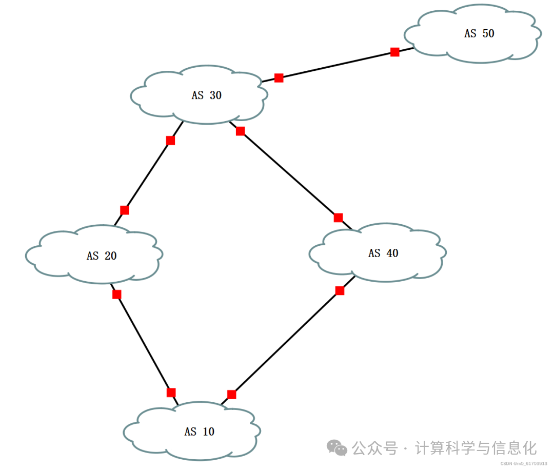 BGP 更新源 BGP并不能主动在网络中寻找邻居,必须手工指定BGP邻居的地址,那么BGP才会将数据包发往指定的地址来请求建立邻居。 与此同时,BGP发出的请求数据包除了写明目标IP地址外,还要写上自己的IP地址,即BGP源地址。 路由器自己产生流量后从接口发出时,流量从哪个接口被发出,那么这些数据包的源IP地址就是哪个接口的地址。 因此当BGP发出数据包寻找邻居时,这些数据包从那些接口被发出,那么BGP源IP地址就是哪个接口的地址。 要两台BGP路由器要正常建立邻居,必须双方路由器都相互指定邻居,相互发送数据包才行。 当一台BGP路由器收到建立邻居的请求后,如果发现数据包的目标IP不是自己的BGP源地址。 那么就拒绝该连接的请求后,只有当请求数据包的目标与自己的BGP源地址相同时,才可建立BGP邻居。 需要注意的是,这个条件只在两个邻居之间,任意一个邻居满足条件即可,并不需要双方都满足; 也就是说一方收到的数据包目标IP与自己的BGP源地址相同即可; 另一方收到的数据包目标IP与它的BGP源地址不同也没关系,只要单方面符合条件就行,但我们通常都将BGP两端的源与目标保持一致。 BGP 的源地址是可以随意更改的,但只能是路由器上的接口地址。如下图:  在上图中,R1与R2之间有两条链路。 当配置BGP邻居时,如果R1指定邻居地址为12. 1.1.2, R2指定邻居地址为12. 1.1.1。 那么在建立邻居过程中,R1 将请求数据包从接口F0/0发出,数据包的目标IP为12. 1. 1.2, BGP 源地址为F0/0的接口地址12. 1.1.1。 当R2将请求数据包从接口F0/0发出时,数据包的目标IP为12.1. 1.1, BGP 源地址为F0/0的接口地址12. 1.1.2。 由于R1发出的数据包目标IP12. 1.1.2与R2的BGP源地址12. 1. 1.2完全相同,所以最终能够正常建立BGP邻居。 R1在检测地址时,R2的目标IP与R1的源也完全相同,通常我们都保证双方一致。 当R1与R2之间的直连接口F0/0中断后,如果双方将数据包从S0/0发出,那么R1的源地址就是10. 1. 1.1, R2的源地址就是20. 1.1.2; 由此可以看出,双方发出的数据包的目标IP都与对方的源地址不符,所以无法建立BGP邻居。 虽然在上面的网络环境中,双方路由器之间都拥有多条链路,在中断某条链路之间,仍然可以通信,但是这并不能保证BGP邻居的永久连接。 为了使拥有多条链路的BGP邻居之间永远保持连接,考虑到路由器的loopback口在设备正常工作的情况下,不会像物理接口那样出现中断,所以建议在BGP邻居之间使用loopback 接口的地址来建立TCP连接。 当指定邻居时,不再将邻居的地址指定为对方物理接口地址,而改为指定对方的loopback地址。 这样一来,既然物理接口中断,只要还有通畅的链路,那么BGP邻居仍然可以保持连接。 在将BGP邻居地址指定为对方loopback地址时,为了使数据包的目标IP与对方的BGP源地址相同,所以邻居也要将BGP源地址更改为自己的loopback接口地址,从而使得双方正常建立BGP连接。 在上图中,当R1指定邻居地址为2.2.2.2,BGP 源地址为1.1.1.1, 而R2指定邻居地址为1.1.1.1, BGP源地址为2.2.2.2,这样一来,双方的目标IP都与对方的BGP源地址相同。 所以可以正常建立邻居,并且在双方链路中,任何一条链路断开,都不影响邻居的会话,BGP 的连接仍然保持而不会中断,实现了连接的冗余性和稳定性。 BGP TTL BGP的路由可能会从一个AS发往另外一个AS,从而穿越多个AS。 但是由于运行BGP的网络会是一个很大的网络,路由从一个AS被发出,可能在经过转发之后,又回到了开始的AS之中,形成路由环路。 所以出于防止环路的目的考虑,BGP 在将路由发往其它AS时,也就是发给eBGP邻居时,需要在路由中写上自己的AS号码。 下一个 AS收到路由后,再发给其它AS时,除了保留之前的AS号码之外,也要添加上自己的AS号码。 这样写在路由中的AS被称为AS -path,如果BGP收到的路由的AS_ PATH中包含自己的AS号码,就认为路由被发了回来,以此断定出现了路由环路,就会丢弃收到的路由。 BGP只有在将路由发给eBGP时,才会在AS- path中添加自己的AS号码,而在发给iBGP时,是不会添加AS号码的。 因为iBGP邻居在同一个AS中,即使要添加,AS 号码全是一样的,所以没有必要。  在上图中,当路由穿越各个AS时,所有发给eBGP邻居的路由,都会在AS-path中添加自己的AS,自己的AS总是添加在AS-path的前面。 例如: 一条路由从AS10被发往AS 20,则AS-path为“10”,当AS 20 将路由发往AS 30时,添加上自己的AS号码20之后,AS- path变成“20, 10”,当AS 30将路由发往AS 50时,AS 50收到的路由的AS-path为“30, 20, 10”。 当AS 30将路由发给AS 40, AS 40再将路由发给AS 10时,路由的AS- path为“40, 30,20, 10”; 由于AS 10 在收到路由后,发现AS- path中包含自己的AS号码10,所以认为出现环路,便丢弃收到的所有路由。 在IGP协议中,我们将路由协议分成两大类:距离矢量路由协议和链路状态路由协议,而BGP被划分为路径矢量路由协议(path-vector routing) ,路径矢量算法结合了距离矢量特性与AS- path防环特性。 因为BGP在将路由发给eBGP邻居时,会将自己的AS号码添加到AS- path中,所以可以以此来防止环路。 而在将路由发给iBGP时,是不会往AS -path添加AS号码的,因此在iBGP之间传递路由时,没有防止环路的机制。 考虑到为iBGP之间的路由传递也加入防环机制,因而强制将BGP路由在AS内部只传一跳。 具体操作为: 一台BGP路由器从eBGP邻居收到路由,发给iBGP邻居之后,iBGP邻居收到后就不能再传给其它任何iBGP邻居,只能传递给eBGP邻居。 此规则被多数人称为BGP的水平分割