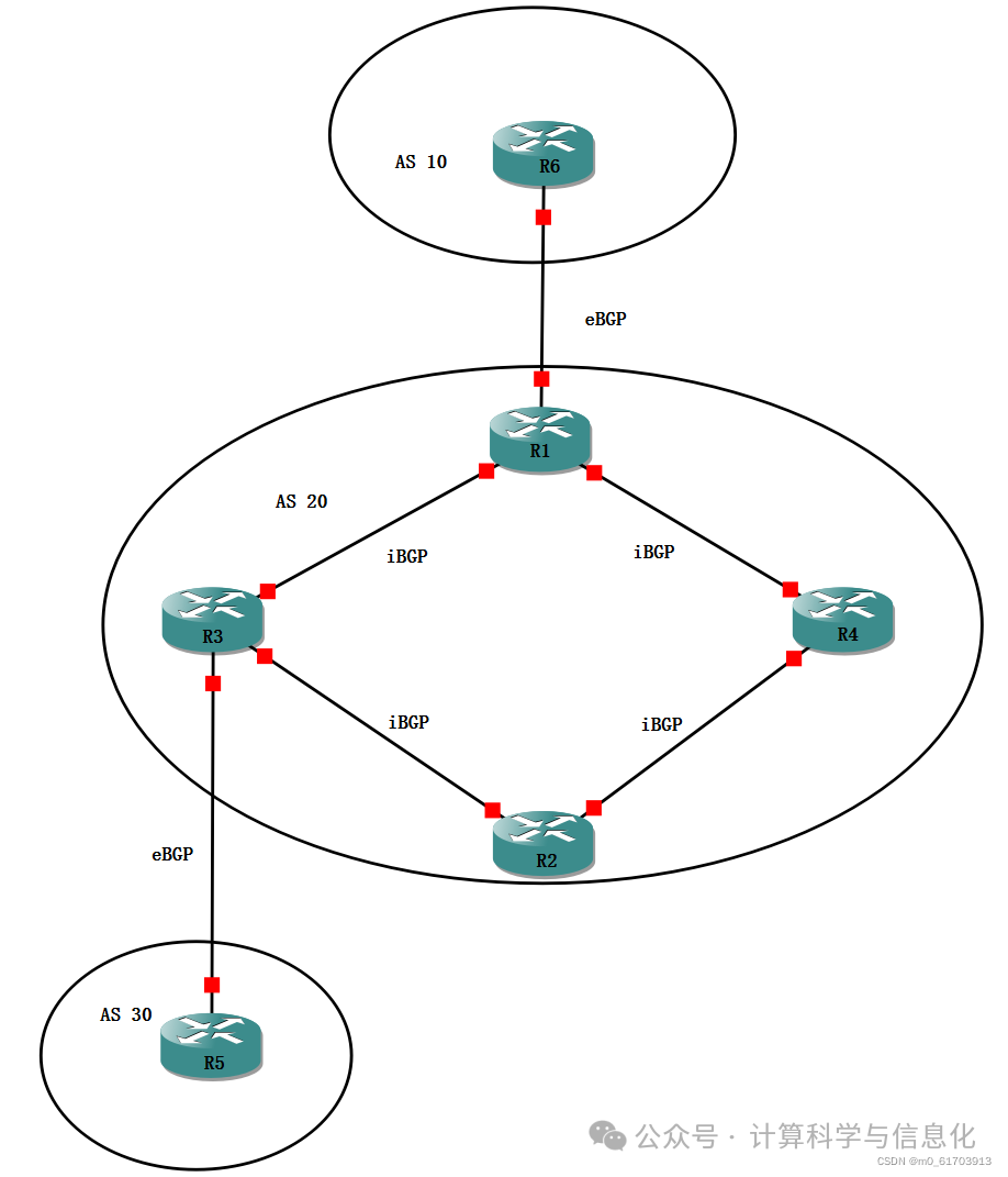 虽然BGP确实有一定难度,但你总得先从技术理论开始吃透它吧? 学习掌握了BGP,对工作中提高网络性能、增强网络稳定性以及安全性等等多方面,都挺关键的。 想吃透BGP,绕不开我今天要说的这些基础概述和实例!基础概述 说BGP之前,我们先从计算机网络的基础开始说起。 当前所使用的计算机网络中,一个网络通常用一个IP网段来表示。 要将所有网络连接起来,并且要通信,就需要将这些IP网段连接起来,让每个IP网段都知道其它IP网段的信息,就可以实现全网通信。 将网络与网络连接起来的设备都是路由器,只要网络中每一台路由器都得知所有的IP网段信息,就可以为全网提供数据转发。  如果某一台路由器不能得知所有的IP网段信息,也就表示这台路由器所连接的网络不能与其他网段通信。 为了帮助路由器获得全网IP网段信息,因此路由协议工作在路由器与路由器之间,让网络中每一台路由器都拥有全网完整的路由信息,从而实现全网可达。 如果路由器协议传递了错误的路由信息,或者没有传递路由信息,将导致某些网络通信的中断,所以路由协议从一台路由收到路由更新后,必须毫不保留地传递给其它路由器。 而当一个网络失效后,也必须告知其它路由器该网段不可达,需要将相应路由器删除。 当全网每一台路由器都需要拥有所有的路由信息,并且完全一致时,这种状态被称为收敛状态,一个网络只有在收敛状态时,才能保证全网可达。 而当今所使用的庞大的互联网,是由数万台路由器连接起来的。 如果每一台路由器都拥有互联网中的每一条路由信息,那么就意味着每一台路由器都将拥有数十万甚至数百万条路由条目,这个数量是惊人的。 但是由于路由协议的特征以及互联网全网通信的需求,就必须让互联网中每一台路由器将自己的路由信息与其它路由器互换,使整个互联网的达到收敛状态。 虽然这是铁定的要求,但是请仔细想一下,这是万万不可能的。 因为一个拥有数万台路由器组建起来的超大型网络,永远不可能达到收敛状态。 当某个网络断开时,先得知的路由器需要将这个信息告知给其它所有路由器,因为信息是一台传一台传过去的,所以一个网络断开的信息要让数万台路由器都知道,这需要很长的时间。 并且可能在这个信息还没有传遍整个网络时,这个之前中断的网络就恢复了正常。 那么这时,先知道的路由器又要重新向网络中通告该网段恢复正常的信息。 如此一来,互联网中不断变化的网络,会让所有路由器不停地传递路由信息,结果是导致网络中路由信息的不一致,也将导致庞大的路由更新影响所有路由器的性能。 因此,互联网中,一个网络的中断与恢复,实在没有必须通告给数以万计的路由器。 而网络的信息,必须向其它路由器通告。 那么,一台路由器的路由信息,既然没有必须向网络中每一台路由器通告,它究竟该通告给哪些路由器呢? 或者换句话说,它的路由更新通告的范围究竟有多大呢? 基于以上种种原因,所以我们将–台路由器的路由更新限制在一定的范围内,也只有这样,一个被划分为更小范围的网络,才能达到收敛状态。 所以现实情况是,我们的互联网被划分成了一个一个更小范围的网络。 任何一台路由器的路由更新,被限制在这个特定的范围内,而这个特定的范围,就是你应该知道的被称为自治系统的网络范围,即autonomous system (AS)。 互联网中路由协议的更新只应该在一一个AS内部传递。 但是互联网是需要全网通信的,所以必须让每一个AS都能够获得其它AS的路由信息才行。 因此,路由协议被定义为两种截然不同的种类,即只在一一个AS内部更新的路由协议,称为Interior Gateway Protocol(IGP) 。 以及在AS 与AS之间更新的路由协议,称为 Border Gateway Protocol (BGP) 。 需要更多的解释,将互联网划分成多个AS,目的并不仅仅是将路由协议的更新限制在特定的范围内; 还有一个重要的原因是,将互联网划分成若千个小范围的网络后,那么这每一个小网络就可以单独定义各自的路由策略与安全策略,并且这样不需要干扰其它AS,也不受其它AS干扰。 比如网络中若干的ISP,这些ISP对自己的网络需要制定自己的策略,又需要让这些策略保持私有性而不与其它ISP互相干扰,所以划分AS,帮他们实现了这个目的。 只能在一个AS内部传递更新的IGP路由协议有RIP, EIGRP, OSPF, IS-IS, 可以在AS之间传递更新的路由协议目前只有BGP。 但是有个特别之处是,EIGRP 也使用了AS的概念来工作。 运行EIGRP的网络也会被划分成多个AS,虽然默认情况下,EIGRP不能在AS与AS之间更新路由信息,但是EIGRP也可以实现AS之间的路由更新。 需要说明的是,EIGRP概念中的AS与BGP的AS并无任何关联,它们之间没有任何共同操作性。 真正的AS是指BGP的AS,而EIGRP不管有什么样的AS特征,它永远被限制在BGP的单一AS之中。 BGP AS 对于BGP的AS号码的分配,是由Internet Assigned Number Authority(IANA)机构来统一规划和分配的。 IOS中运行的BGP,目前最多支持4字节长度的AS号码,但并不表示所有AS号码都能任意配置。 在2009年1月之后,(IANA)决定使用4字节长度AS范围是65535-4294967295。 当前,通常还是使用2字节长度的AS,也就是1-65535,所以不对4字节的AS号码做太多讨论。 因为BGP是使用在互联网之中的,互联网由多个BGP AS域组成,所以互联网中不能出现AS号码相同的域。 如果一台路由器要接入互联网并运行BGP,那么必须向IANA申请合法的AS号码。 为了考