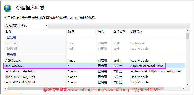 (2)点击右侧的“处理程序映射”,双击打开列表,可看到已启用的分组中包含了针对 aspNetCore 应用的处理程序为 AspNetCoreModuleV2 模块