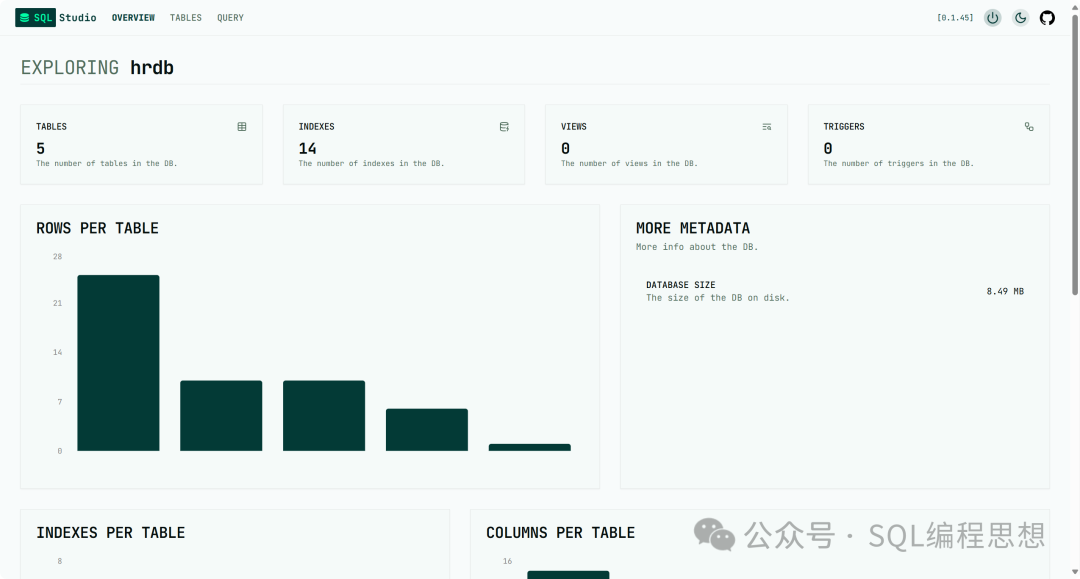 • • 表结构概览:TABLES 页面显示了每个表的具体信息,包括字段数量、索引数量、总行数以及表的大小。