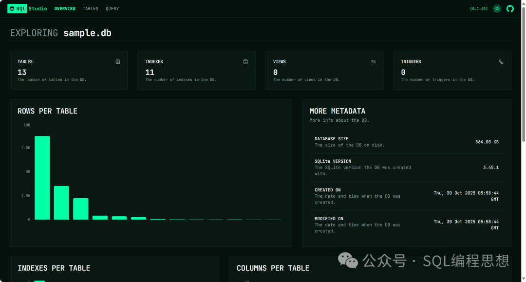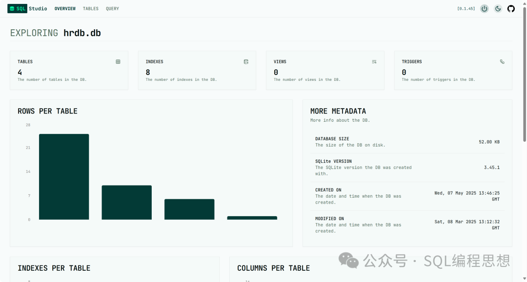 • • 数据库概览:Overview 页面提供了关于数据库的汇总信息,包括表、索引、视图、触发器的数量、表中的行数汇总、数据库大小等。