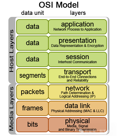 七层分别为物理层,数据链路层,网络层,传输层,会话层,表示层,应用层。对于任何一台在网络上的计算机来说,都有两个网络地址,一个是基于网卡的MAC地址, 另外一个是IP地址