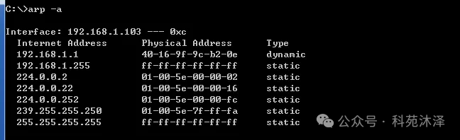 ARP欺骗正是利用ARP协议的无状态性,通过捏造不存在的MAC地址更新操作系统ARP路 由缓存表。Windowns下查询ARP缓存表的命令及显示如下: